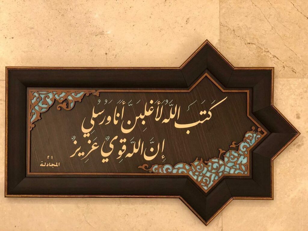 { كَتَبَ ٱللَّهُ لَأَغۡلِبَنَّ أَنَا۠ وَرُسُلِیۤۚ إِنَّ ٱللَّهَ قَوِیٌّ عَزِیزࣱ } [المُجَادلَةِ:٢١] «Allah has written, “I will surely overcome, I and My messengers.” Indeed, Allah is Powerful and Exalted in Might.» (The arguing woman:21) #قران_كريم #خط_عربي